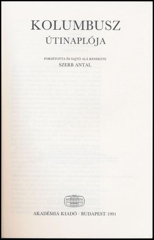 Kolumbusz útinaplója. Fordította és sajtó alá rendezte: Szerb Antal. B... https://www.darabanth.com/de/320-Fernauktion/320.0/Bucher/Bucher-Geschichte~2000004/Kolumbusz-utinaploja-Forditotta-es-sajto-ala-rendezte-Szerb-Antal-Bp-1991-Akademia-Kiad~II1754666