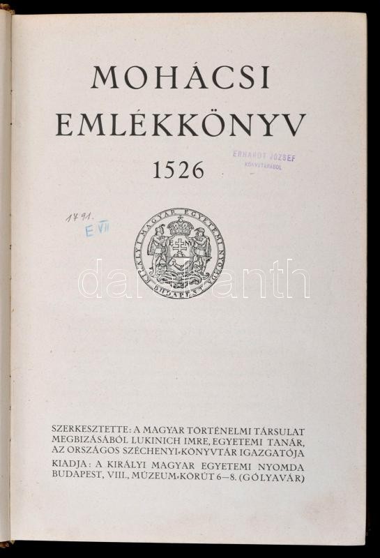 Mohácsi emlékkönyv 1526. Szerk. Lukinich Imre. Bp.,(1926). Kir. Magyar Egyetemi Nyomda. Kiadói aranyozott egészbőr-kötés, kissé kopott borítóval, kissé sérült gerinccel.