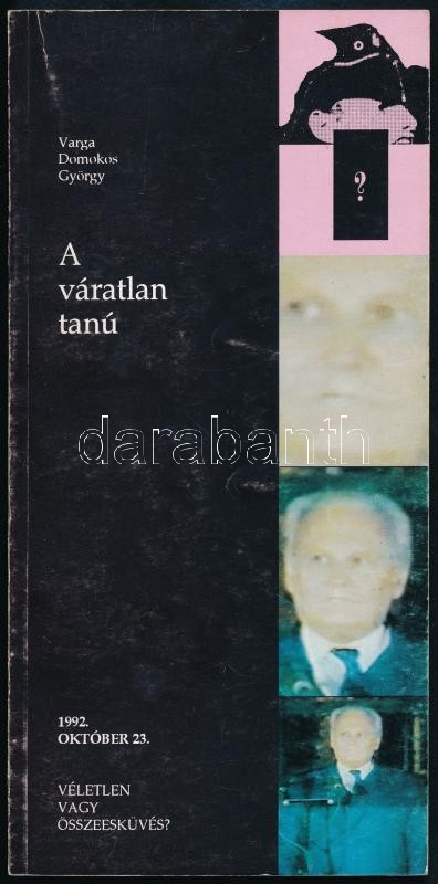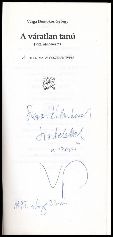 Varga Domokos György: A váratlan tanú. 1992. október 23. Véletlen vagy összeesküvés? Bp.,1995, ÉSÁ. Kiadói papírkötés. Megjelent 3000 példányban. A szerző által dedikált! Varga Domokos György könyve Göncz Árpád kifütyüléséről.