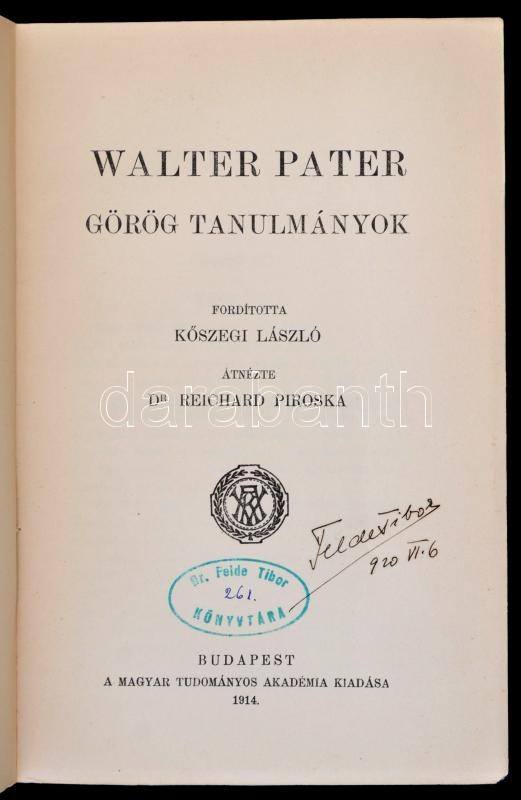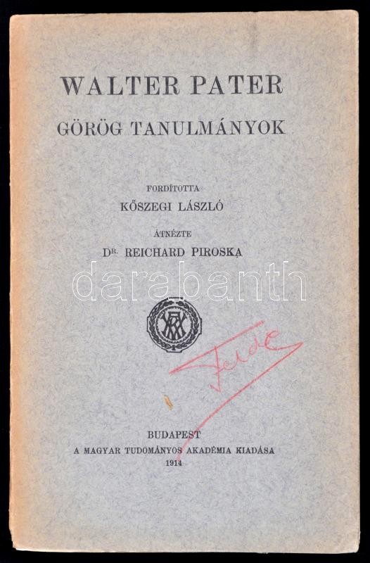Walter Pater: Görög tanulmányok. Fordította Kőszegi László. Bp., 1914, MTA. Kiadói papírkötés, a gerince részben elvált a borítótól, a gerince szétvált.