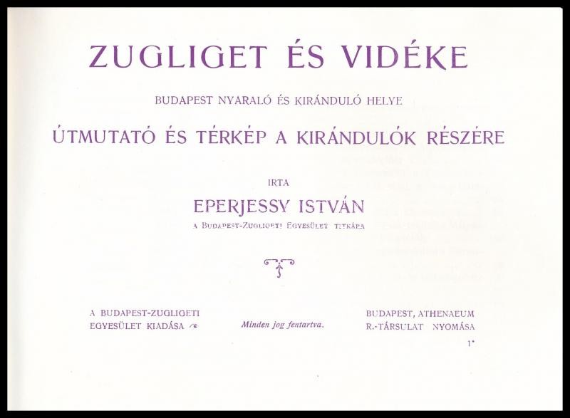 Eperjessy István: Zugliget és vidéke. Budapest nyaraló és kiránduló helye. Útmutató és térkép a kirándulók részére. Bp., 1991, Pátria. Harmadik kiadás. Az 1906-os kiadás reprintje. Kiadói papírkötésben.