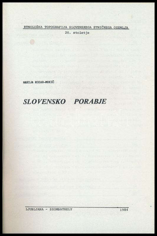 Mukicsné Kozár Mária/Marija Kozar-Mukic: Szlovénvidék. A Szlovén Etnikai Terület Néprajzi Topográfiája 20. század. / Slovensko porabje. Etnoloska Topografija Slovenskega Etnicega Ozemlja. Ljubljana-Szombathely, 1984, Edvard Kardelj Egyetem Bölcsézettudományi Karának Tudományos Intézete-Savaria Múzeum, 225+2+21+1 p. Fekete-fehér fotókkal, két térképpel illusztrálva. Magyar és szlovén nyelven. Kiadói papírkötés. Megjelent 800 példányban.