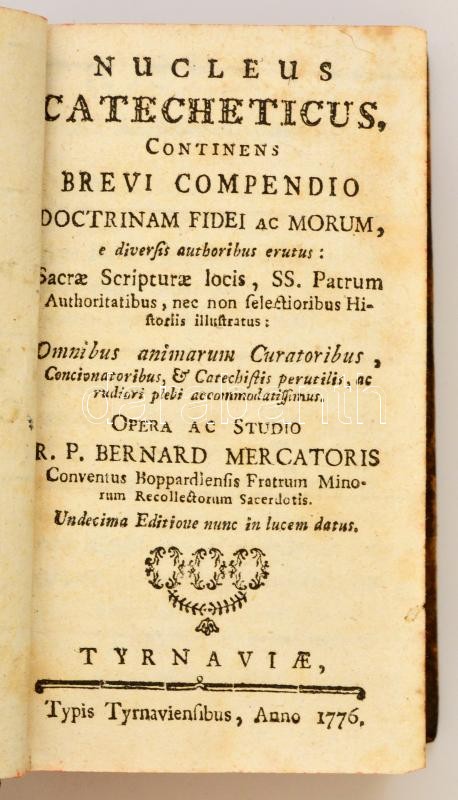 Mercator, Bernardinus: Nucleus catecheticus continens brevi compendio doctrinam fidei ac morum e diversis authoribus erutus. Nagyszombat, 1776, typis Tyrnaviensibus. Kicsit kopott bőrkötésben, jó állapotban.