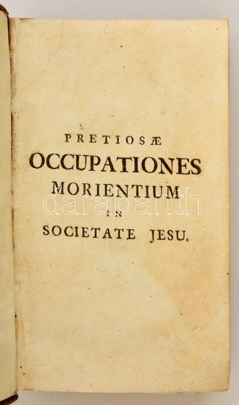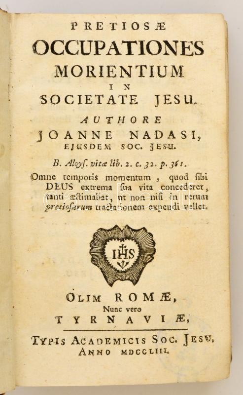 Nádasi János: Pretiosae occupationes morientium in Societate Jesu. Nagyszombat, 1753, typis academicis Societatis Jesu. Kissé kopott bőrkötésben, egyébként jó állapotban.