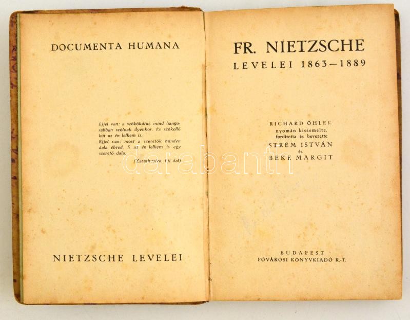 Friedrich Nietzsche: Fr. Nietzsche levelei 1863-1889. Richard Öhler nyomán kiszemelte, fordította, és bevezette Strém István, és Beke Margit. Documenta Humana. Bp.,[1923], Fővárosi Könyvkiadó Rt. Korabeli átkötött kartonált papírkötésben, kissé kopott borítóval, kissé foltos lapokkal. Megjelent 100 példányban.