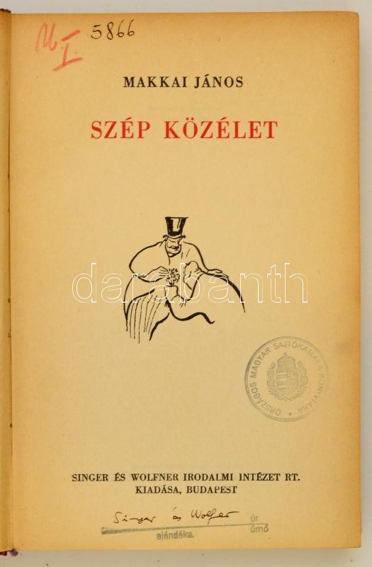 Makkai János: Szép közélet. Bp.,é.n., Singer és Wolfner, Pesti Lloyd Nyomda. 194+1 p. Kiadói félvászon-kötés, kissé kopott borítóval, kissé sérült gerinccel. Singer és Wolfner ajándék kötete bejegyzéssel.