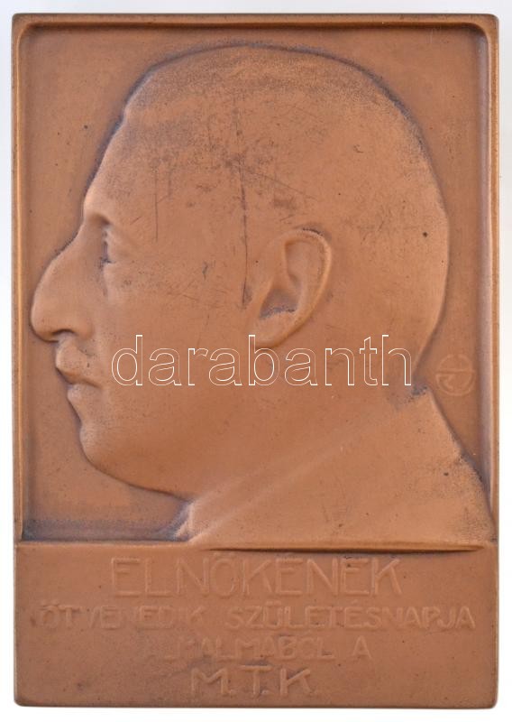 Beschreibung: Szentgyörgyi István (1881-1939) ~1920. "Elnökének ötvenedik születésnapja alkalmából a M.T.K." Br emlékplakett (78x112mm) T:2,2-