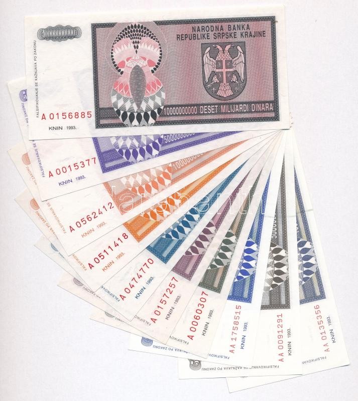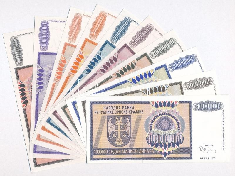 Beschreibung: Horvátország / Krajna Szerb Köztársaság 1993. 1.000.000D + 5.000.000D + 10.000.000D + 20.000.000D + 50.000.000D + 100.000.000D + 500.000.000D + 1.000.000.000D + 5.000.000.000D + 10.000.000.000D T:I Croatia / Republic of Serbian Krajina 1993. 1.000.000 Dinara + 5.000.000 Dinara + 10.000.000 Dinara + 20.000.000 Dinara + 50.000.000 Dinara + 100.000.000 Dinara + 500.000.000 Dinara + 1.000.000.000 Dinara + 5.000.000.000 Dinara + 10.000.000.000 Dinara T:UNC