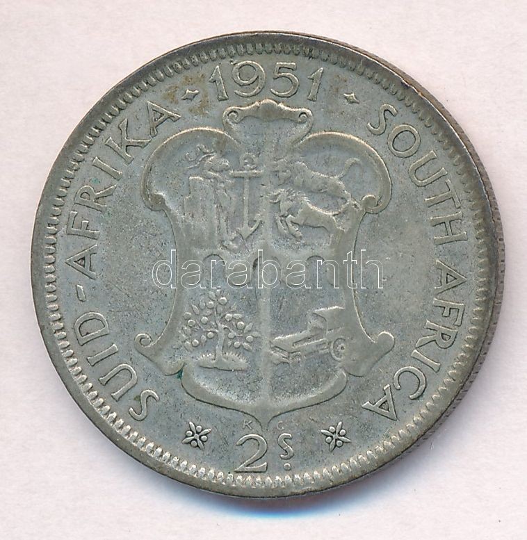 South Africa 19... https://www.darabanth.com/de/320-Fernauktion/320.0/Numismatik/Weltweit-Munzen~2500012/Del-Afrika-1951-2Sh-Ag-II-Erzsebet-T2---South-Africa-1951-2-Shilling-Ag-Elisabeth-II-CVF-~II1766462