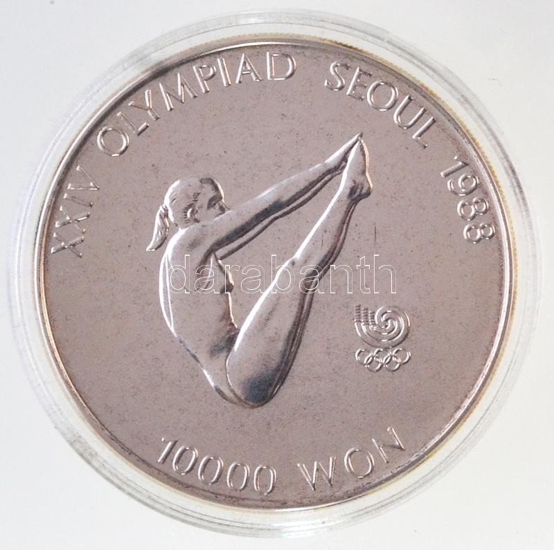 Dél-Korea 1987. 10.000W Ag "1988 Olimpia - Műugrás" eredeti dísztokban, tanúsítvánnyal T:BU South Korea 1987. 10.0000 Won Ag "1988 Olympics - Diving" in original case with certificate C:BU