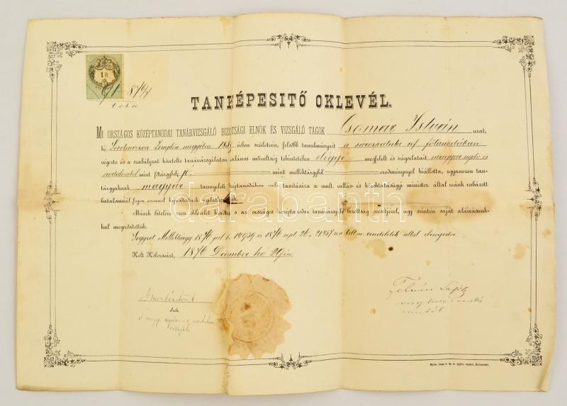 Beschreibung: 1876 Kolozsvár magyar tanári oklevél Felméri Lajos (1840-1894) író tanár aláírásával