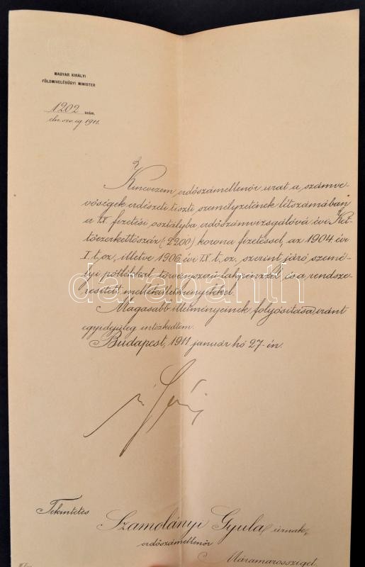 Beschreibung: 1911 Szamolányi Gyula költÅ‘ erdÅ‘számvizsgálói kinevezése, Máramarossziget, Serényi Béla (1866-1919) földművelésügyi miniszter (1910-1913) aláÃrásával, a minisztérium fejléces papÃrján,