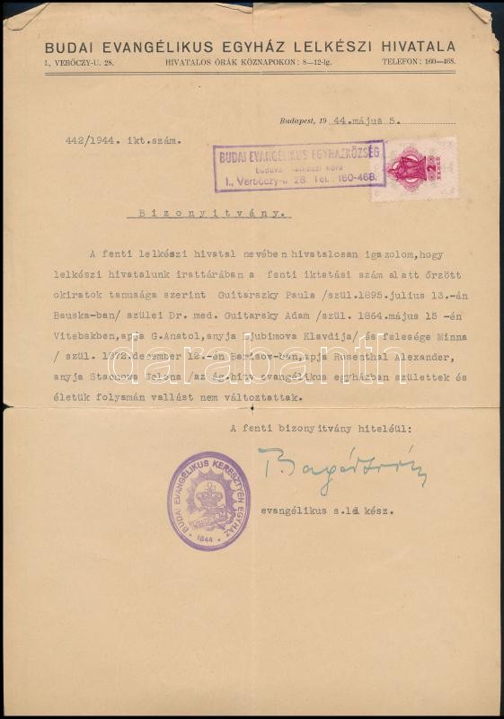 1944 Bp., A Budai Evangélikus Egyház Lelkészi Hivatala által kiállítot... https://www.darabanth.com/de/321-Fernauktion/321.0/Andere-Sammelgebiete/Dokument~500016/1944-Bp-A-Budai-Evangelikus-Egyhaz-Lelkeszi-Hivatala-altal-kiallitott-szarmazasi-bizonyit~II1780348