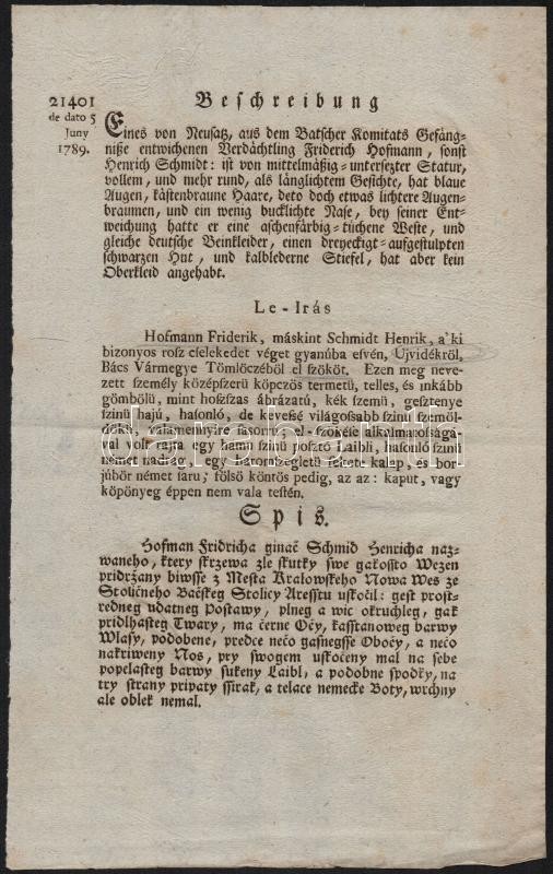 1789 Újvidéki tömlöcből szökött rab háromnyelvű körözvénye. https://www.darabanth.com/de/321-Fernauktion/321.0/Andere-Sammelgebiete/Drucksachen~500029/1789-Ujvideki-tomlocbol-szokott-rab-haromnyelvu-korozvenye~II1779339