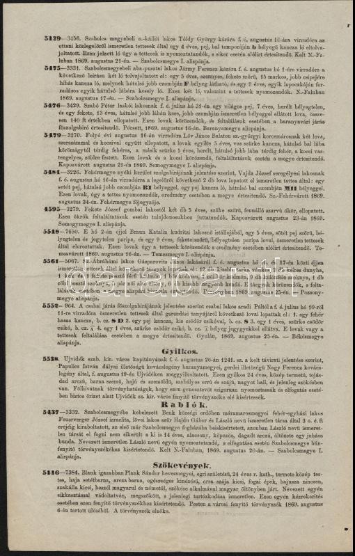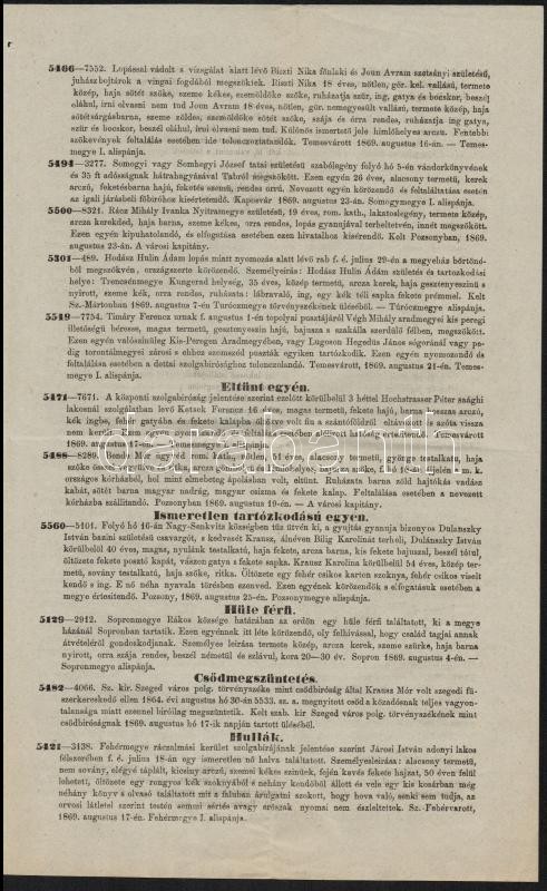 Beschreibung: 1869 A m. kir. Belügyminisztérium körözvénye mindennemű dolgokról, rablók, gyilkosok, megtalált "hüle" 4p.