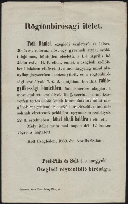 1869 Rögtönbírósági ítélet rablógyilkos ügyében. Cegléd. 22x35 cm https://www.darabanth.com/de/321-Fernauktion/321.0/Andere-Sammelgebiete/Drucksachen~500029/1869-Rogtonbirosagi-itelet-rablogyilkos-ugyeben-Cegled-22x35-cm~II1779352