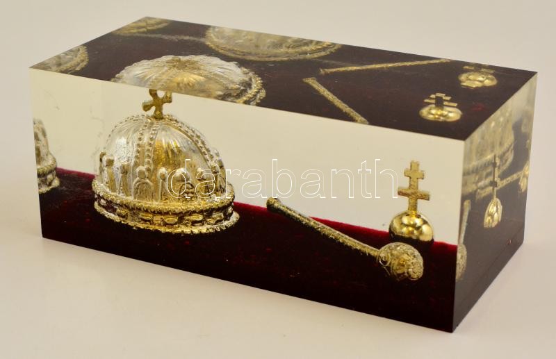 Beschreibung: A Szent Koronát, az országalmát és a jogart ábrázoló dekoratív műanyag asztali levélnehezék, 16×7,5×6,5 cm