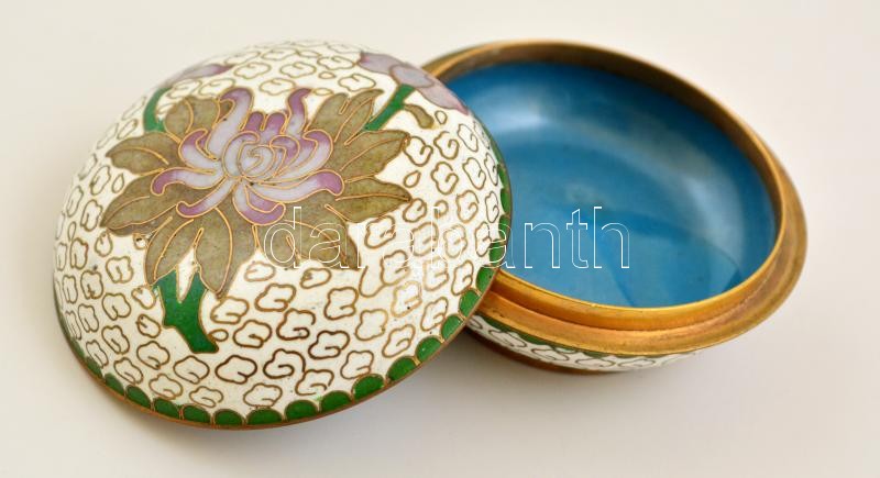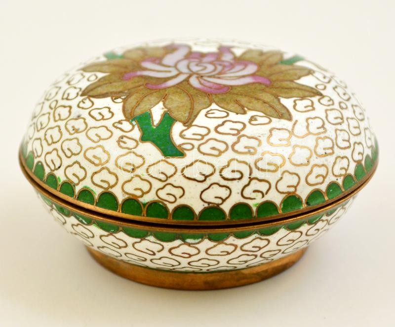 Beschreibung: Virágmintás zománcozott réz ékszertartó dobozka, d: 6 cm, m: 3 cm