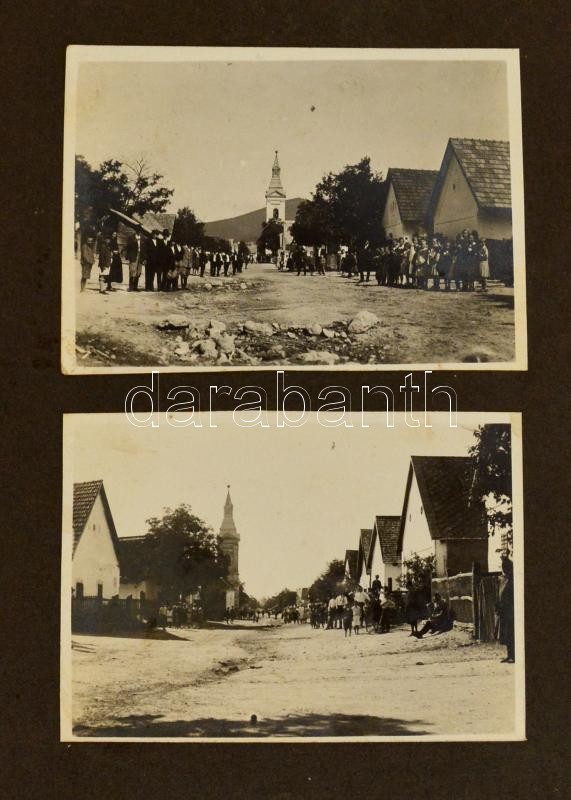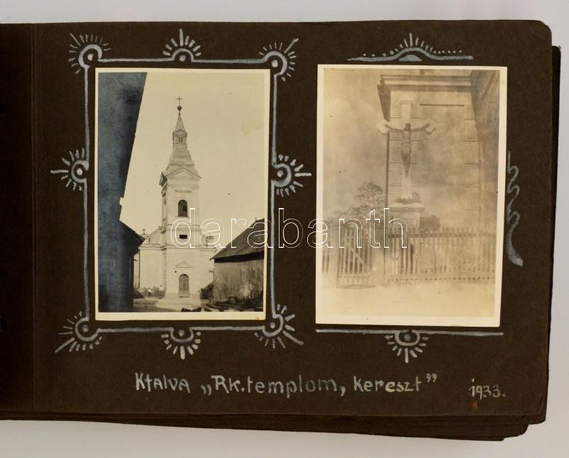 1932-1942 Családi fotóalbum, sok családi képpel, néhány kézzel színezett fotóval, károlyfalvai (Magyarország) részletekkel, több mint 100 beragasztott fotóval