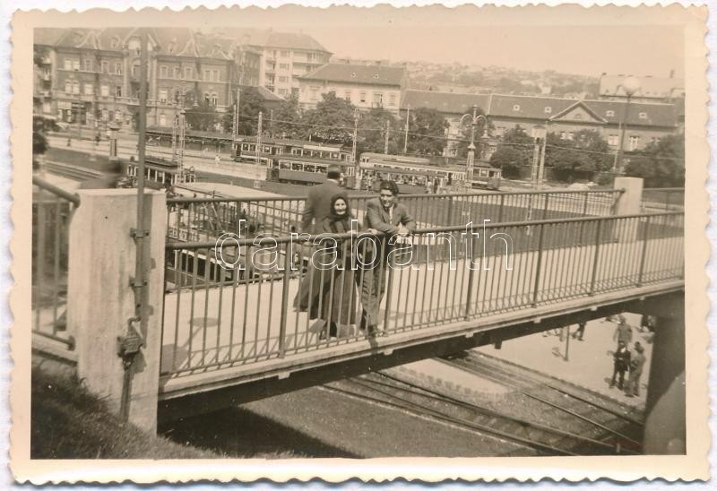 Beschreibung: cca 1940 Budapest, Széll Kálmán tér, háttérben a villamosokkal, fotó, 6×9 cm