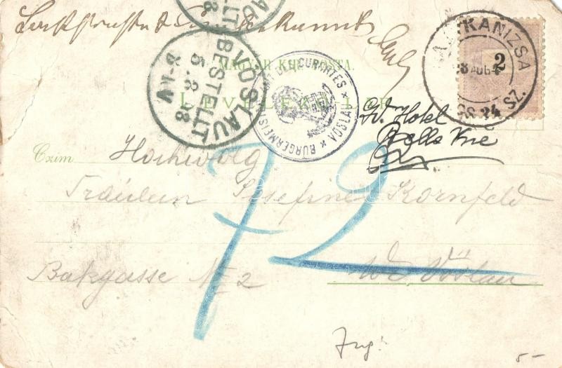 Beschreibung: 1898 Keszthely, látkép, Festetics palota, kastély, Hullám és Balaton szálloda. Mérei Ignác No. 687. Art Nouveau, floral, litho (EM)