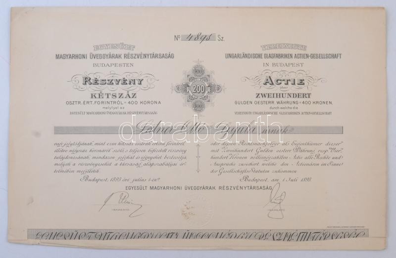 Budapest 1893. "Egyesült Magyarhoni Üveggyárak Részvénytársaság Budape... https://www.darabanth.com/de/321-Fernauktion/321.0/Numismatik/Aktien-und-Tickets~2500004/Budapest-1893-Egyesult-Magyarhoni-Uveggyarak-Reszvenytarsasag-Budapesten-nevre-szolo-rC3~II1782401