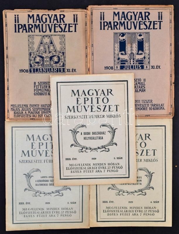 Beschreibung: 1908-1929 a Magyar iparművészet 2 db és a Magyar építőművészet 3 db lapszáma, érdekes írásokkal