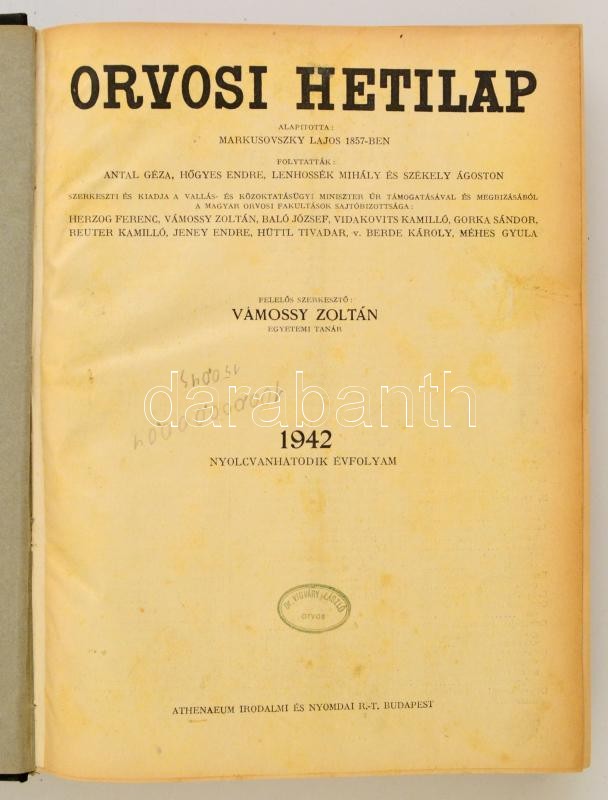 1942 Orvosi hetilap, 1942. 86. évf. 1-52. szám. Teljes évfolyam bekötve. Szerk.: Vámossy Zoltán. Bp.,1934,. Kopottas félvászon-kötésben, rengeteg korabeli reklámmal.