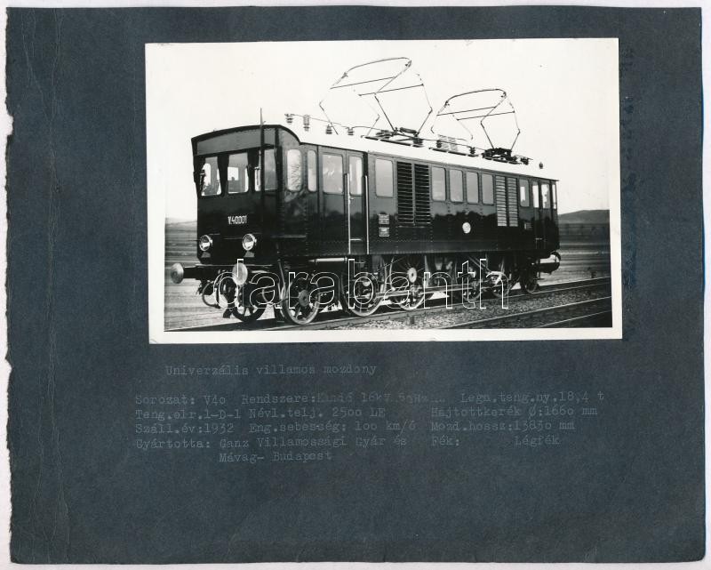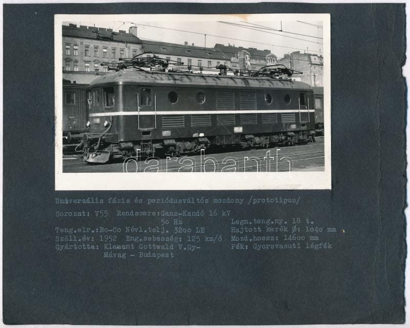 1932, 1952 Ganz-MÁVAG univerzális villamos mozdony és Klement Gottwald - MÁVAG mozdony, 2 db későbbi előhívás, albumlapra ragasztva, részletes leírással, 9×14 cm / locomotives, Ganz-MÁVAG and Gottwald - MÁVAG, 2 modern copies of vintage photos, 9x14 cm