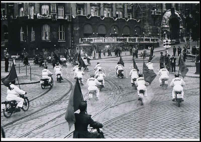 Beschreibung: cca 1948 Motorverseny és a verseny utáni felvonulás Budapesten, 5 db vintage negatívról készült mai nagyítás, 18x25 cm