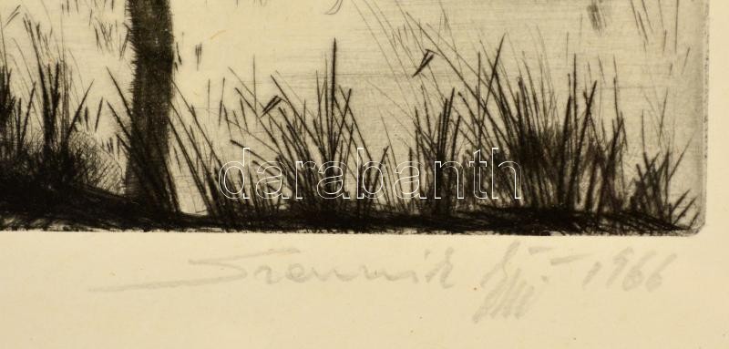 Beschreibung: Szennik György (1923-2007): Három fűzfa, rézkarc, papír, jelzett, üvegezett keretben, 19×29 cm