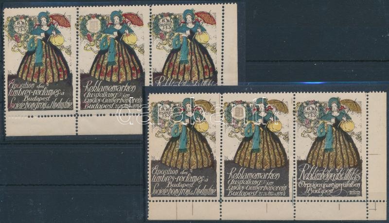 Beschreibung: 1914 Reklámbélyeg kiállítás levélzáró 2 db ívsarki hármascsík (színeltérés)