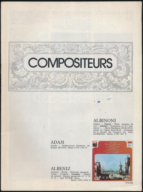 Compositeurs c. nyomtatvány, borító nélkül, benne 16 db többségében zenészek, éenekesek, karmesterek aláírásával, közte Yehudi Menuhin (1916-1999)(2x), Daniel Barenboim (1942-) karmester, Michel Béroff (1950-) zongorista, Helen Donath (1940-) énekesnő, és mások aláírásaival.