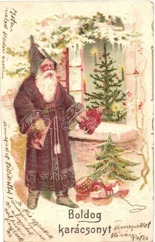 Beschreibung: Boldog Karácsonyt! / Christmas greeting card. Saint Nicholas with gifts and Christmas tree. Emb. litho (EK)