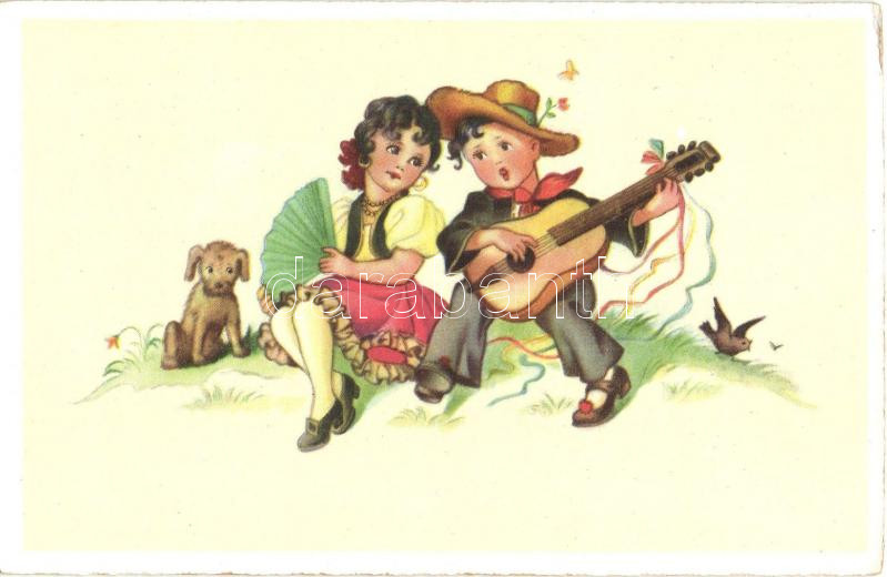 Children, dog, guitar, Ha. Co. 7458. https://www.darabanth.com/de/322-Fernauktion/322.0/Ansichtskarten/Kinder~2000038/Children-dog-guitar-Ha-Co-7458~II1390763