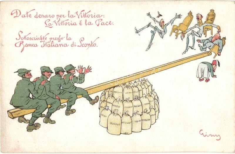 Date denaro per la Vittoria: La Vittoria e la Pace. Sottoscrivete presto la Banca Italiana di Sconto / Give money for Victory and Peace. Subscribe to the Italian Discount Bank early! WWI Italian humorous military art postcard, artist signed