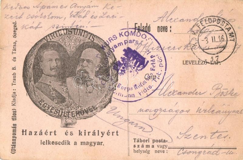Hazáért és királyért lelkesedik a magyar. Egyesült erővel - Viribus Unitis! Osztrák-magyar tábori postai levelezőlap Ferenc József és II. Vilmos képével / K.u.K. Feldpost / WWI Austro-Hungarian K.u.K. Military field post with Franz Joseph and Wilhelm II, Viribus Unitis propaganda + Tiszti tanfolyam Offiziers Kurs Korps Hofmann (EK)