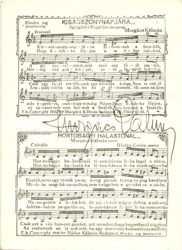 Murgács Kálmán nótaszerző kottás képeslapja Murgács Kálmán aláírásával https://www.darabanth.com/de/322-Fernauktion/322.0/Ansichtskarten/Musik-Musikanten~2000108/Murgacs-Kalman-notaszerzo-kottas-kepeslapja-Murgacs-Kalman-alairasaval~II1787503