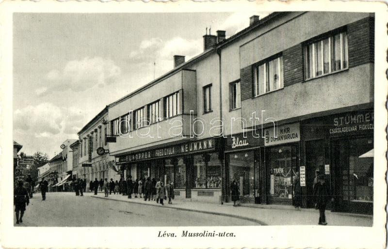 Léva, Levice; Mussolini utca, Popper, Fried Gyula, Neumann, Blau üzlet... https://www.darabanth.com/de/322-Fernauktion/322.0/Ansichtskarten/Slowakei~2000008/Leva-Levice-Mussolini-utca-Popper-Fried-Gyula-Neumann-Blau-uzletei-Stuhmer-csokoladegya~II1783097