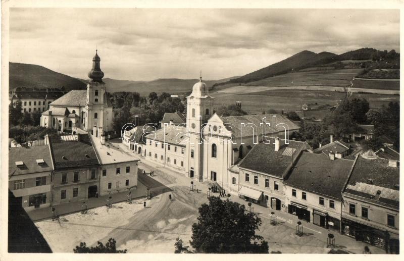 Rozsnyó, Roznava; látkép, Fő tér, székesegyház, Sajó-Vidék, Sztan, Schnitzer üzletei, Tátra Bank / main square, cathedral, shops, bank