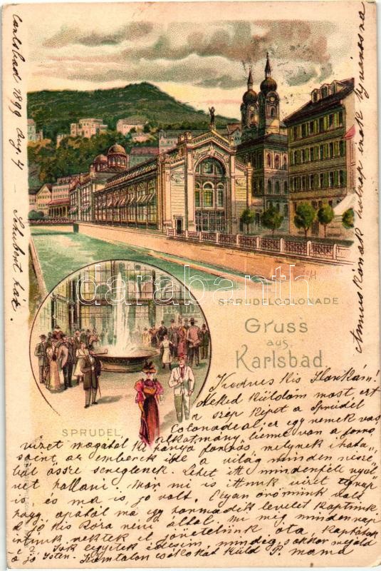 Beschreibung: 1899 Karlovy Vary, Karlsbad; Sprudelcolonnade, Sprudel / fountain. litho