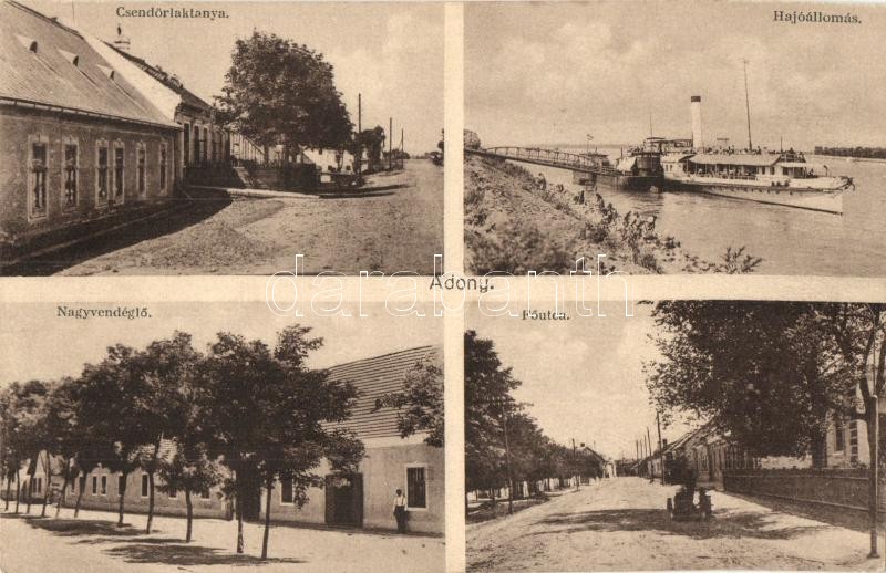 Adony, Csendőr laktanya, Hajóállomás, gőzhajó, Nagyvendéglő, étterem, ... https://www.darabanth.com/de/322-Fernauktion/322.0/Ansichtskarten/Ungarn~2000006/Adony-Csendor-laktanya-Hajoallomas-gozhajo-Nagyvendeglo-etterem-Fo-utca-Raboczky-A~II1787222