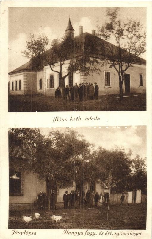 Beschreibung: Jászdózsa, Római katolikus iskola, Hangya Fogyasztási Szövetkezet üzlete és saját kiadása