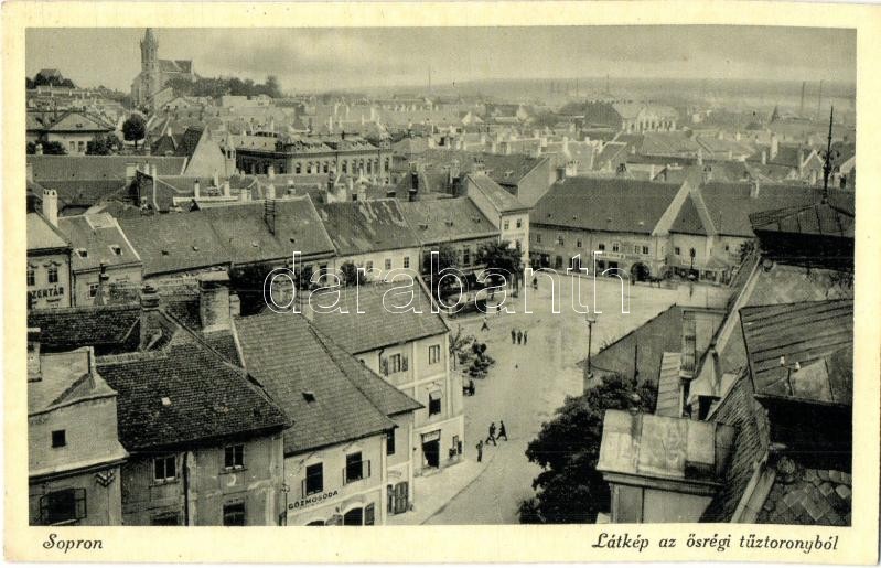 Beschreibung: Sopron, látkép az ősrégi tűztoronyból, Gőzmosoda, üzletek
