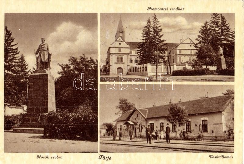 Türje, Premontrei rendház, Hősök szobra, vasútállomás https://www.darabanth.com/de/322-Fernauktion/322.0/Ansichtskarten/Ungarn~2000006/Turje-Premontrei-rendhaz-Hosok-szobra-vasutallomas~II1742084