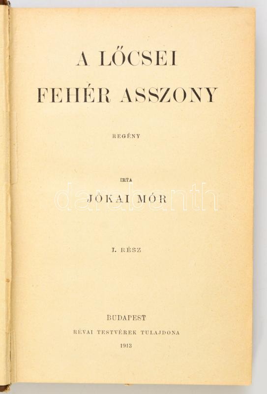 Jókai Mór: A lőcsei fehér asszony I-II. kötet. Jókai Mór ujabb regényei. Bp.,1913 Révai. Kiadói aranyozott egészvászon-kötés, Gottermayer-kötés, kopott gerinccel, kissé laza fűzéssel.