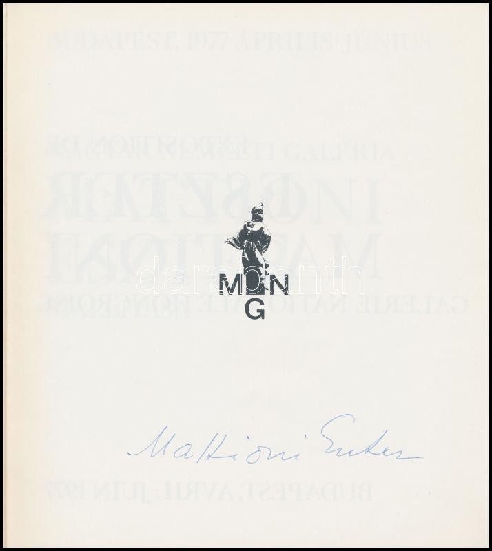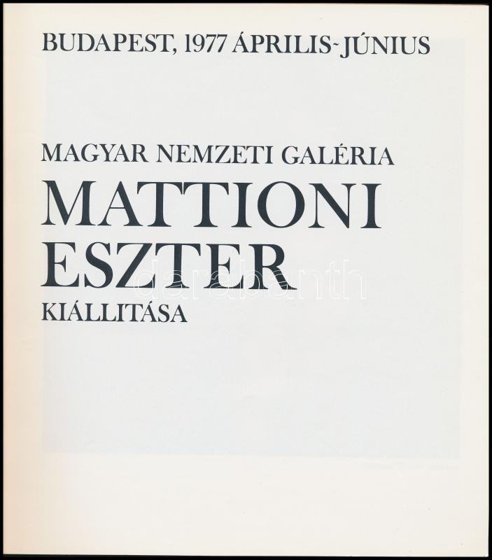 Mattioni Eszter kiállítása. Magyar Nemzeti Galéria Budapest 1977 Árpilis-Június. Bp.,1977, Magyar Nemzeti Galéria, (Zalaegerszeg, Magyar Hírdető-ny.) Fekete-fehér és színes képekkel illusztrálva. Kiadói papírkötés. A művész, Mattioni Eszter (1902-1993) által aláírt.