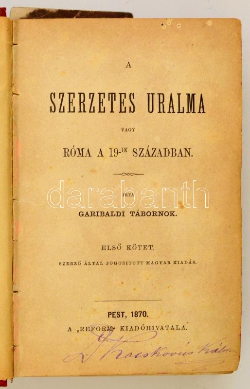Garibaldi Tábornok [Giuseppe Garibaldi]: A szerzetes uralma vagy Róma a 19-ik században. I-II. kötet. Pest, 1870, Reform, XIV+265+IV+315 p. Átkötött félvászon-kötés, márványozott lapélekkel, kopott borítóval.