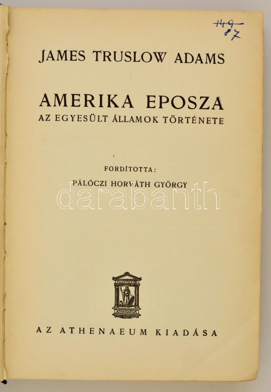 James Truslow Adams: Amerika eposza. Az Egyesült Államok Története. Fordította: Pálóczi Horváth György. Bp.,é.n., Athenaeum. Kiadói egészvászon-kötés, kissé kopottas borítóval.
