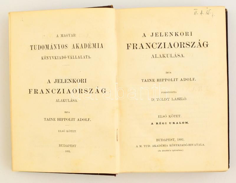 Taine, Hippolit Adolf: A jelenkori Francziaroszág alakulása. Ford. Dr. Toldy László, Csiky Gergely. 1 köt.